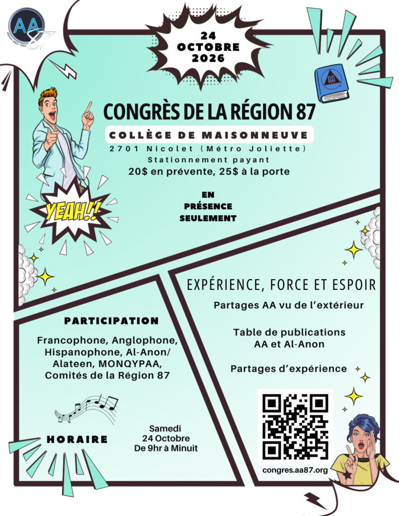 Le congrès régional est une occasion unique de partager notre vécu, de puiser dans la force de notre unité et de transmettre l’espoir à l’alcoolique qui souffre encore.